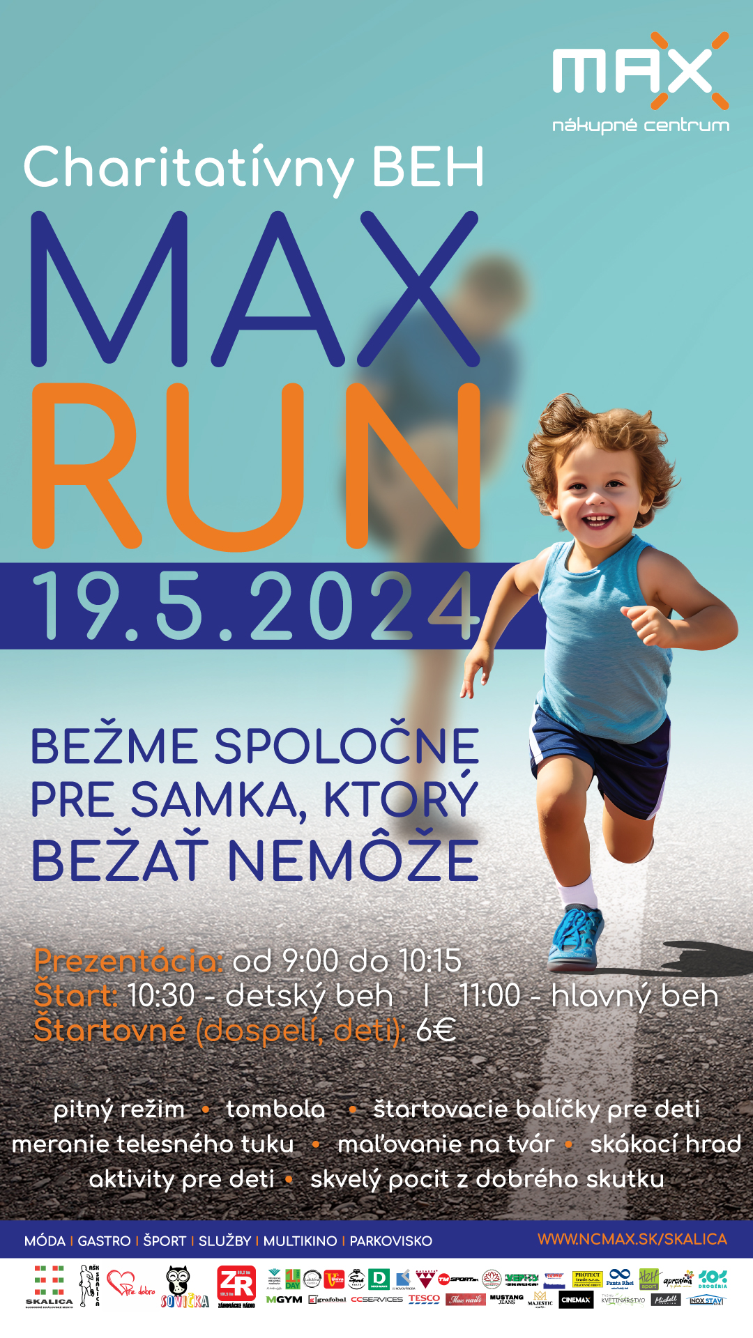 Srdečne Ťa pozývame na charitatívny beh MAX RUN, ktorý sa uskutoční 19. mája . Čakajú nás tri